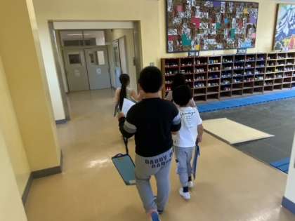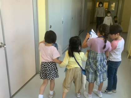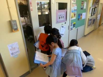 3、4時間目を使っての学校たんけんです。2年生が1年生へ学校を案内して回っています。どちらもとても楽しそうです。