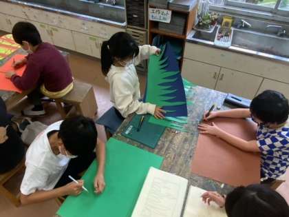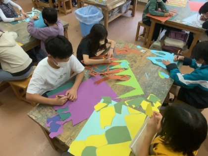 図工で切り絵制作をしています。背景の紙に糊で貼り、生き物を隠していきます。