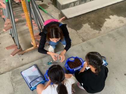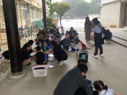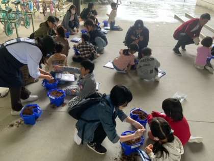 ピロティで、保護者の方々のお手伝いをいただきながら、アサガオの植え付けをしました。