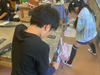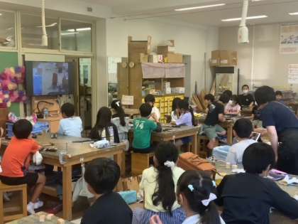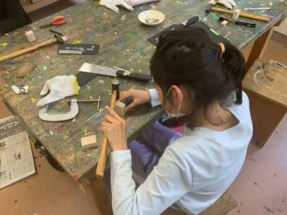図工で工具の使い方を覚えて、トントンギコギコと木工作をします。クランプで角材を固定して両刃のこぎりで切ったり、げんのうで釘を打ったりしています。