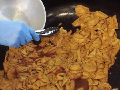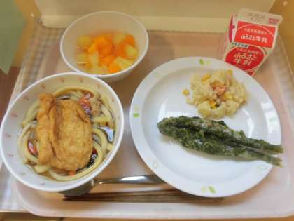 ☆今月の郷土料理は、大阪府の「きつねうどん」です。明治26年船場のうどん店「うさみ亭マツバヤ」で添え物として出した油揚げを、客が素うどんにのせて食べたことが、きつねうどんの始まりといわれています。給食室では、油揚げを大釜でじっくり味をしみ込ませて調理しました。