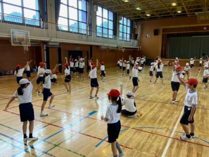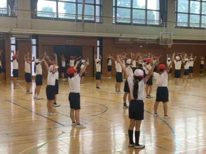 5年生は短縄を使っての表現種目です。曲に合わせて様々な跳び方を組み合わせていきます。