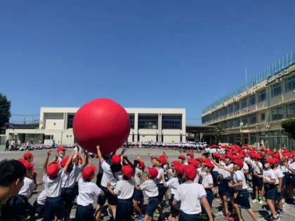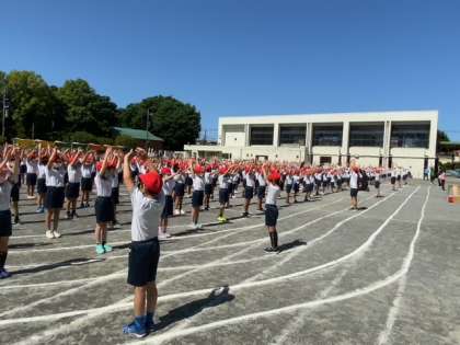 運動会全体練習で、入場行進や準備運動、大玉送りの主に隊形移動の練習をしました。