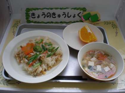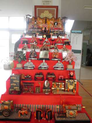 明日はひな祭りです。第二昇降口に主事さんが雛人形を飾ってくれました。今日の給食は、五目ずし、吉野汁、ネーブルとひな祭りにふさわしいものでした。