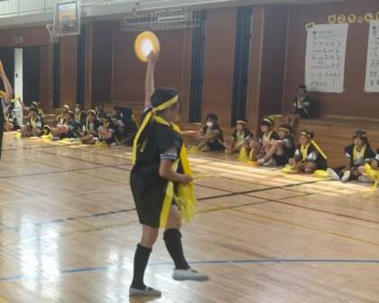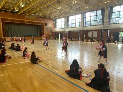 4年生が、体育館と校庭で、エイサーの発表会をしています。リラックスした中で、力一杯踊ることができています。