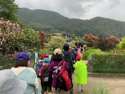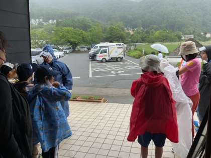 大石公園で楽しみにしていたソフトクリームやジュースなどを買いました。少し雨が降ってますので、雨宿りをしながら食べてます。