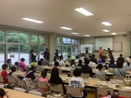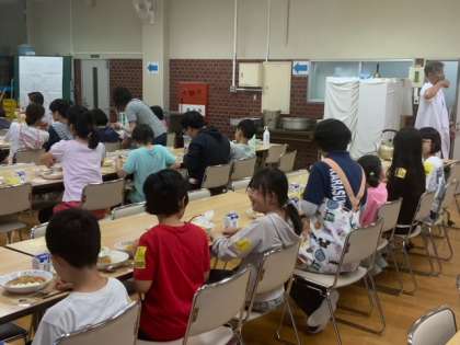 1日目の宿舎での夕食です。いただきますのあいさつが、烏山小学校です。