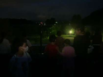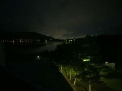 宿舎の屋上に行って空や河口湖を見に行きました。星は見えませんでしたが、とても涼しくて河口湖近くの灯りできれいです。