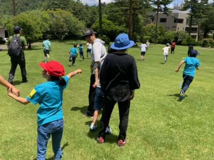 後半は、交流遊びです。だるまさんがころんだ、ハンカチ落とし、しっぽ取りに分かれて遊んでいます。