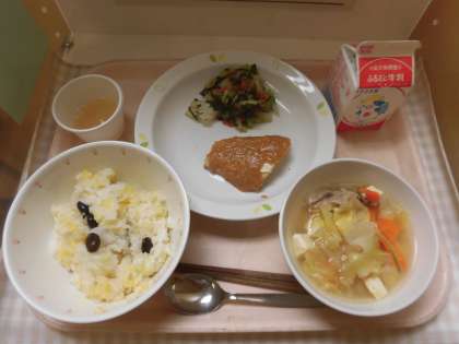 今月の郷土料理は、富山県の「きびおこわ」です。富山県黒部市宇奈月地区に伝わるミネラルが豊富な「いなきび」と黒部産の丹波黒豆を混ぜて炊き上げたものです。鮮やかな黄色に仕上がるのが特徴といわれています。給食では、丹波の黒豆の変わりに黒大豆を代用しました。