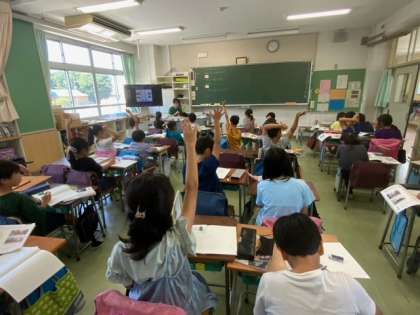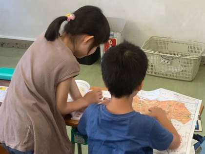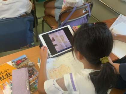 社会「わたしたちの世田谷区」で、商店の様子を調べていきます。予想を立てて、地図や資料集などを使いながら、近くの友達と相談しながら進めています。