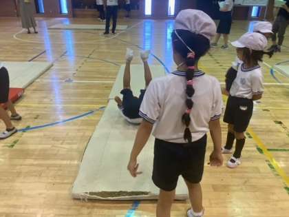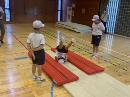 準備体操を十分に行い、後転のポイントを知って、自分のめあてに合わせて友達と一緒に練習をしていきます。