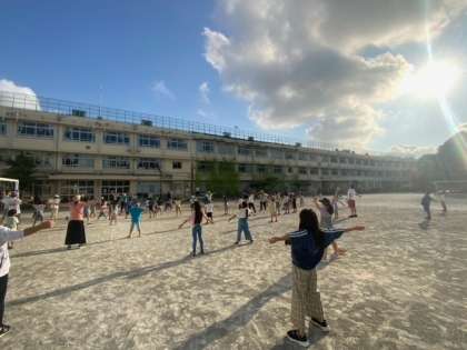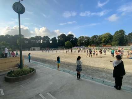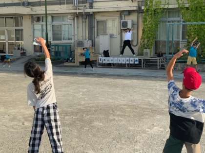 今日から3日間、朝のラジオ体操を放送に合わせての実施です。大勢の子どもたちと保護者の皆さんの参加がありました。朝礼台には「烏山小150周年」の掲示もあり、ボランティアの子どもたちが、前で見本の体操をしています。学校運営委員の皆様、企画と運営をありがとうございます。