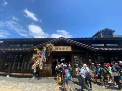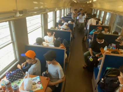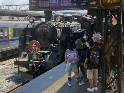 約30分ほど遅れて下今市駅に到着しました。ホームへ向かいますとSLがすぐにホームへ入ってきました。座席に着いたらさっそくお弁当です。朝早くからご準備くださりありがとうございます。雨予報でしたが、いいお天気です。も