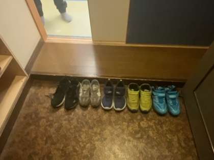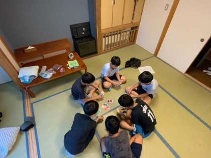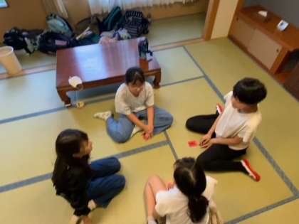 入浴が、まだの班は部屋でトランプやゲームでくつろいでいます。入口の靴がキレイに揃えられていて気持ちがいいです。