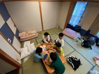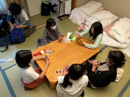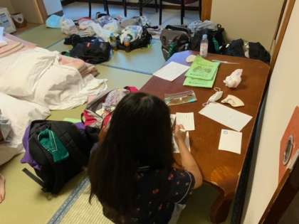 夕食までの時間をそれぞれの部屋で過ごしています。時間を見つけてハガキを書いています。