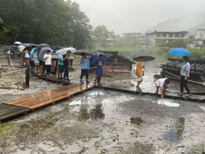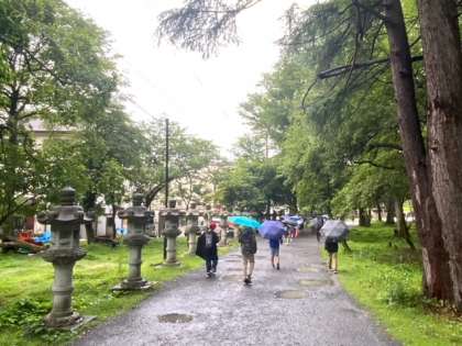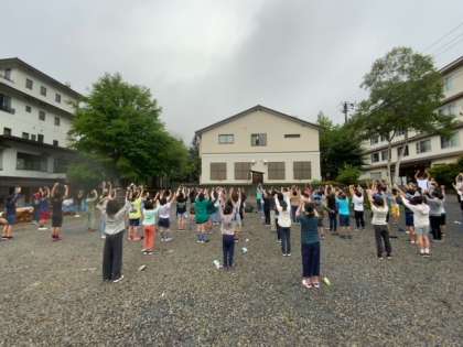 3日目の朝会です。雨が止んできたので外で行いました。ラジオ体操をお話しがあり、少し降ってきたので傘をさして、近くの源泉まで散歩に出かけました。