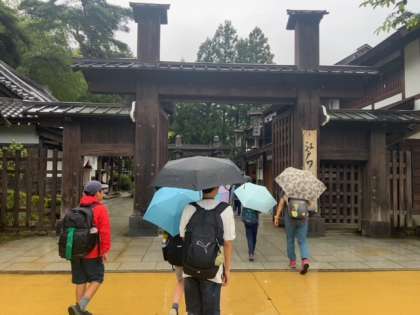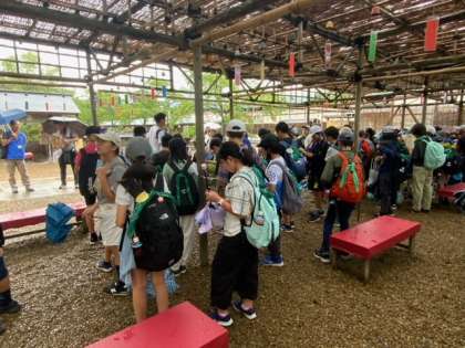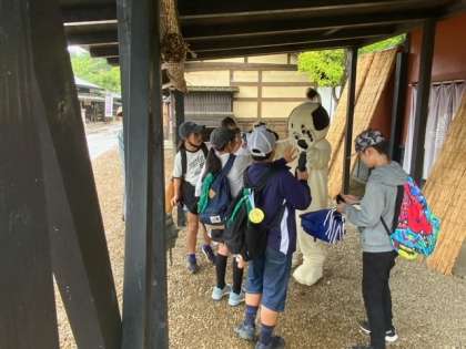 日光江戸村に到着しました。雨が降っていますが小雨になってきました。入口をくぐると江戸時代にタイムスリップをしたようです。江戸村では、班行動となります。キャラクターのニャンまげに会えて喜ぶ班もあります。