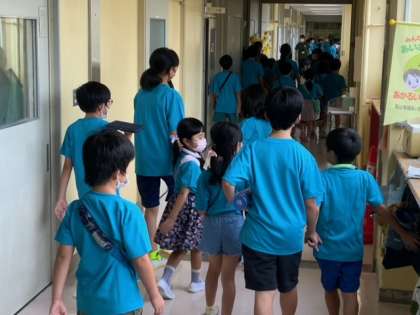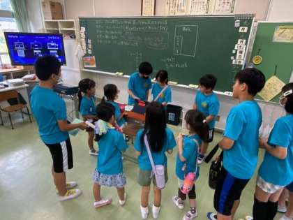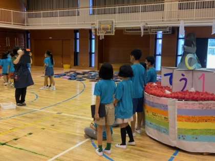 第2部は、たてわり班に分かれてオリエンテーリングや班ごとに記念ケーキオブジェの前で記念撮影をするなどしました。
