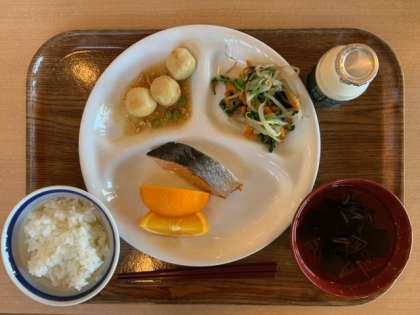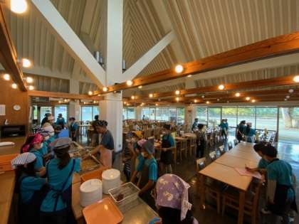 宿の食堂での朝食です。食事係さんが準備を進めました。