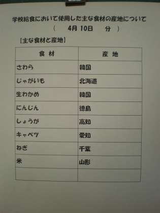 今日の給食の産地です。