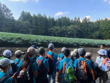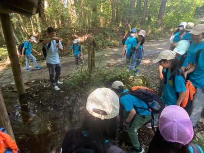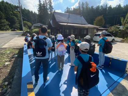 村めぐりです。こんにゃく芋畑を見たり、とても大きな計りに皆で乗って重さを測ったり、鍛治沢の水を触ってみたりしました。