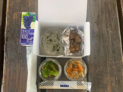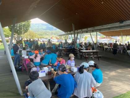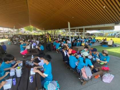 出園プラザの大屋根の下で、お昼ごはんです。班ごとに楽しく食べています。