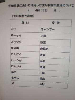 4/11 今日の給食の食材の産地
