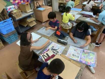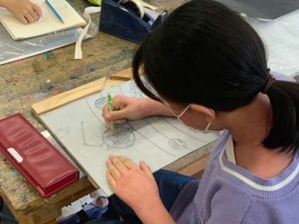 図工「宇宙へGO!!」です。下描きを仕上げて、下描きの線に沿って版木を彫っていきます。