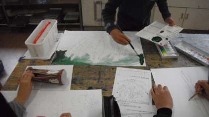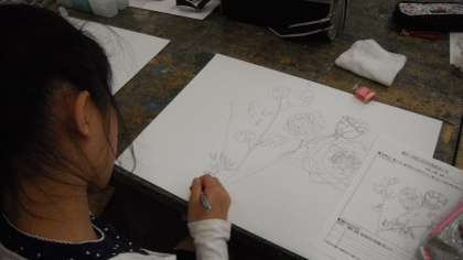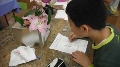 6年生の図工で、花を見たに香りや形や色を参考に自分の花を描いていました。それぞれの子ども達が想像力を膨らませ、素敵な花を描いていました。