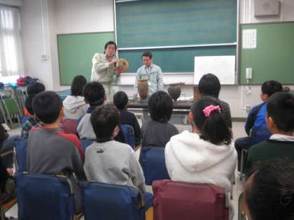 今日は6年生が世田谷区の学芸員の方に来ていただいて、烏山小学校の近くで発掘された土器についてお話を伺いました。