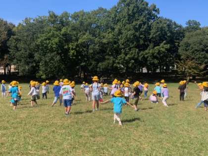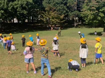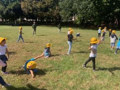 広場で全員で「だるまさんがころんだ」をして遊びました。広い場所で思いっきり体を動かしてとても気持ちがいいです。
