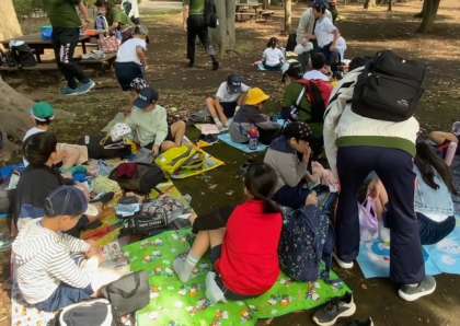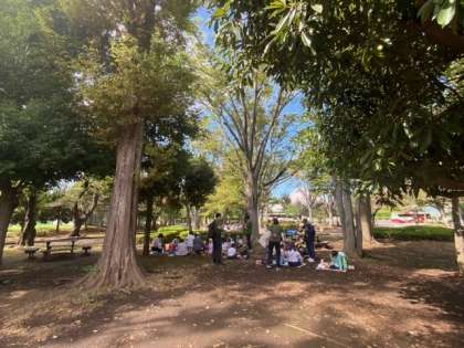 体育館の近くの外でお弁当を食べます。とても気持ちがいいです。