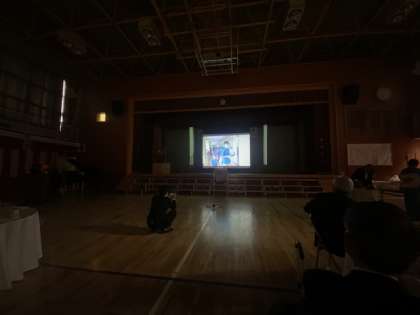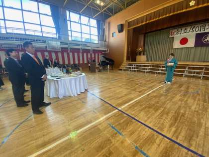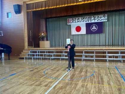 祝賀会では、祝う会の会長からのご挨拶や歴代の校長先生からお祝いのことばをいただきました。多くの方々にご参集いただき、顔と顔を合わせて語らい、共に150周年を祝うとても素敵な会でした。学校に寄贈いただいた電動スクリーンとプロジェクターのお披露目もありました。