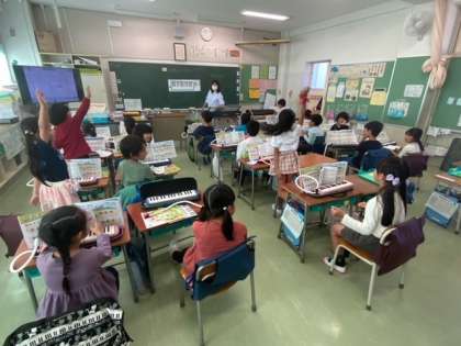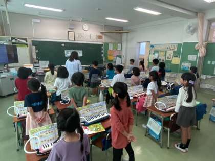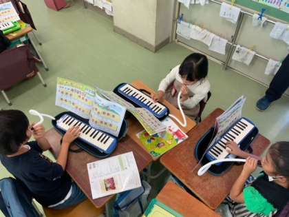 音楽で、今月の歌「だれにだってお誕生日」や校歌を歌いました。もう校歌は覚えて歌えています。鍵盤ハーモニカでは、タンギングに気をつけて吹きました。