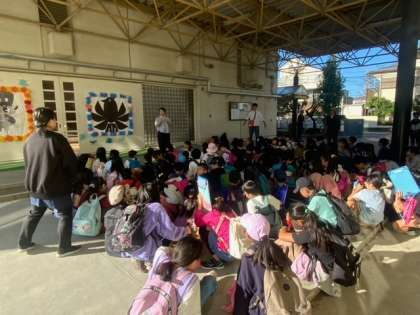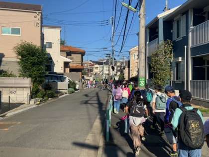とてもいいお天気です。つくし学級の4年生と4年生で、観光バスに乗り、浅草方面と中央防波堤処分場の社会科見学に出かけます。出発式を終えて、いよいよ出発です。