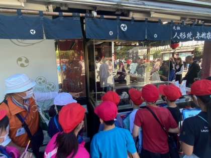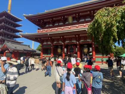 浅草に到着しました。たくさんの人たちが観光で訪れています。日本語以外の言葉がたくさん交わされています。班ごとに分かれて、現地のガイドさんに説明をしていただきながら見学をします。