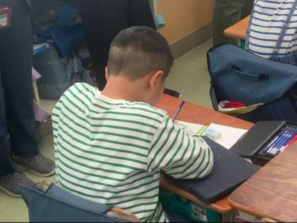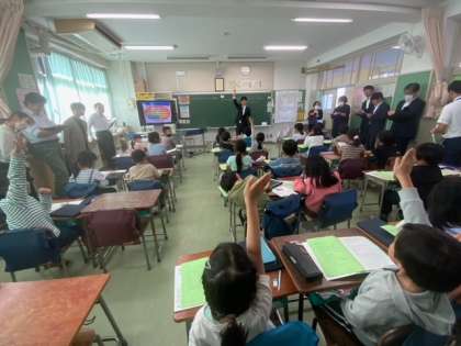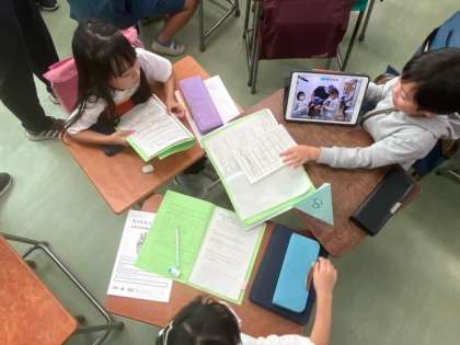 生活科のまち探検でそれぞれが見つけた まちのお気に入りをお友達に伝え合います。友達同士でたくさんの気付きがある様子が見られました。