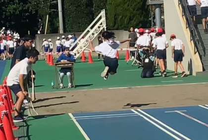 50メートルハードル走、100メートル走、走り幅跳びが行われています。本格的な競技場での貴重な体験です。ほ