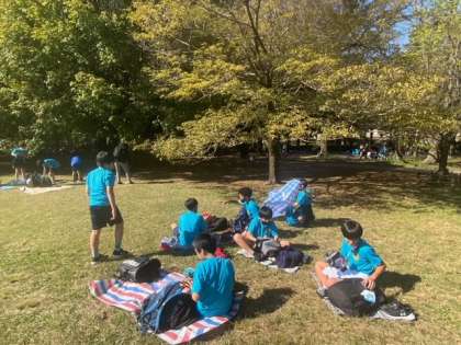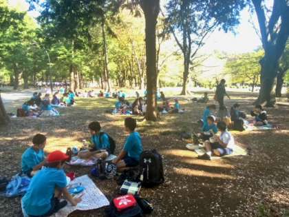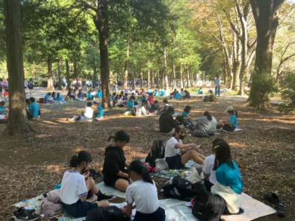 砧公園でお弁当です。声をかけ合ってグループになって食べました。食べ終わったら学校に戻ります。