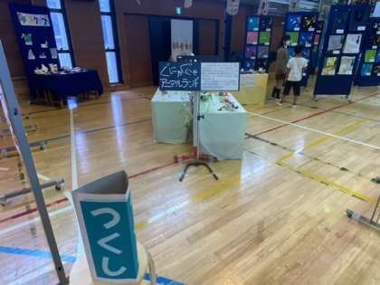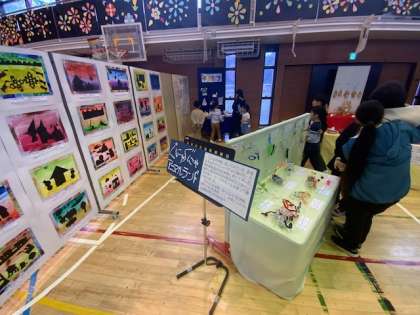 平面作品「ゆめいろの世界」立体作品「ぐにゃぐにゃアニマルランド」家庭科「カラフルティッシュボックス」です。
