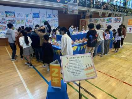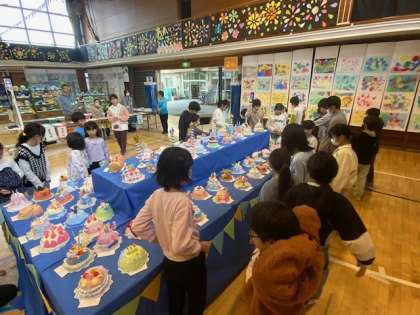 2年生は、平面作品「えのぐをたらしたかたちから」、平面作品「いろいろもよう」、立体作品「150さいバースデーケーキ」です。