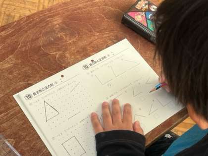 算数で、三角形と四角形について学んでいます。定規を使って作図もしています。