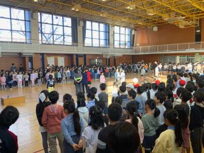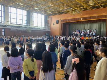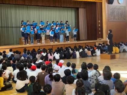 体育館に全校児童が集まり、音楽朝会を行いました。今月の歌は、「もみじ」です。高学年がアルトのパートを歌い、体育館にいい声が響き渡りました。よく口を開けて歌えている子どもたちは、中央に呼ばれて見本となりました。合唱団の歌の披露もありました。