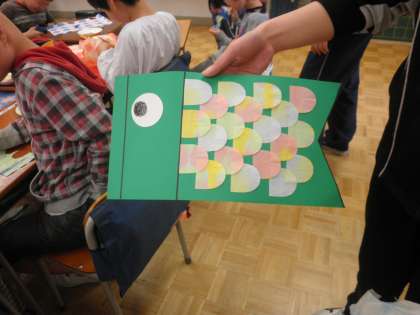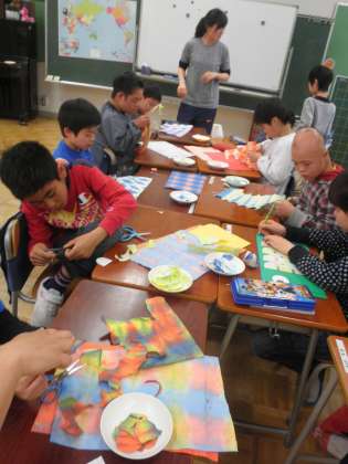 低学年は、花の名前の学習をしていました。高学年は和紙を染めたものをうろこ型に切って鯉のぼりを作っていました。色がカラフルで、とてもきれいです。