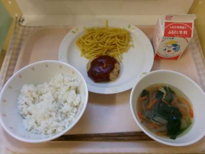 ☆今日の給食は、エコ給食委員会が考えた「スーパーヤミーハンバーグ」です。