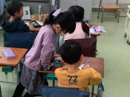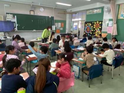 国語で友達の好きなことを聞いてプリントに書いていきます。お互いにインタビューし合っています。