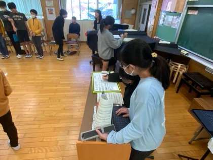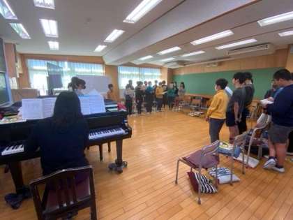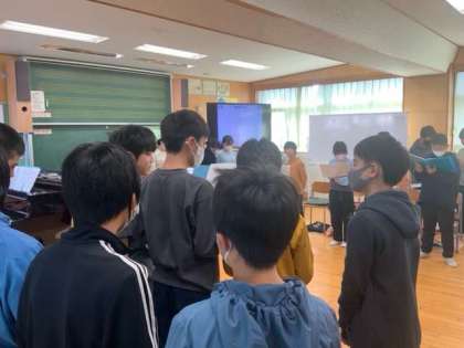 音楽で合唱に取り組んでいます。リーダーさんがめあてにそって進めています。終わりに合わせをしました。よく声が出ています。