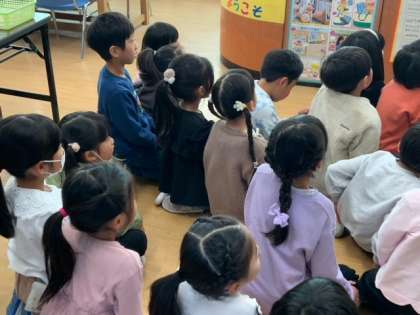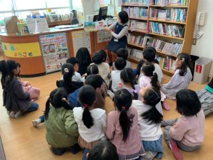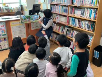 図書の時間での読み聞かせです。お話しの世界に入って夢中になっています。