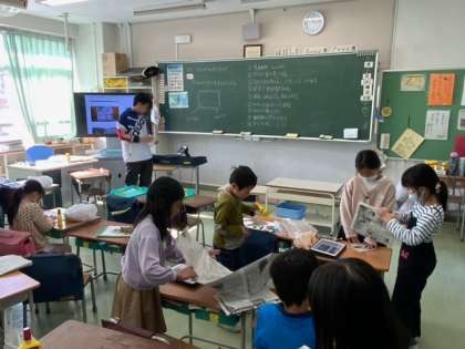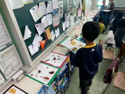 図工のしぜんからのおくりもので、秋さがしで見つけた葉っぱなどを使って、画用紙に工夫して貼っていきます。